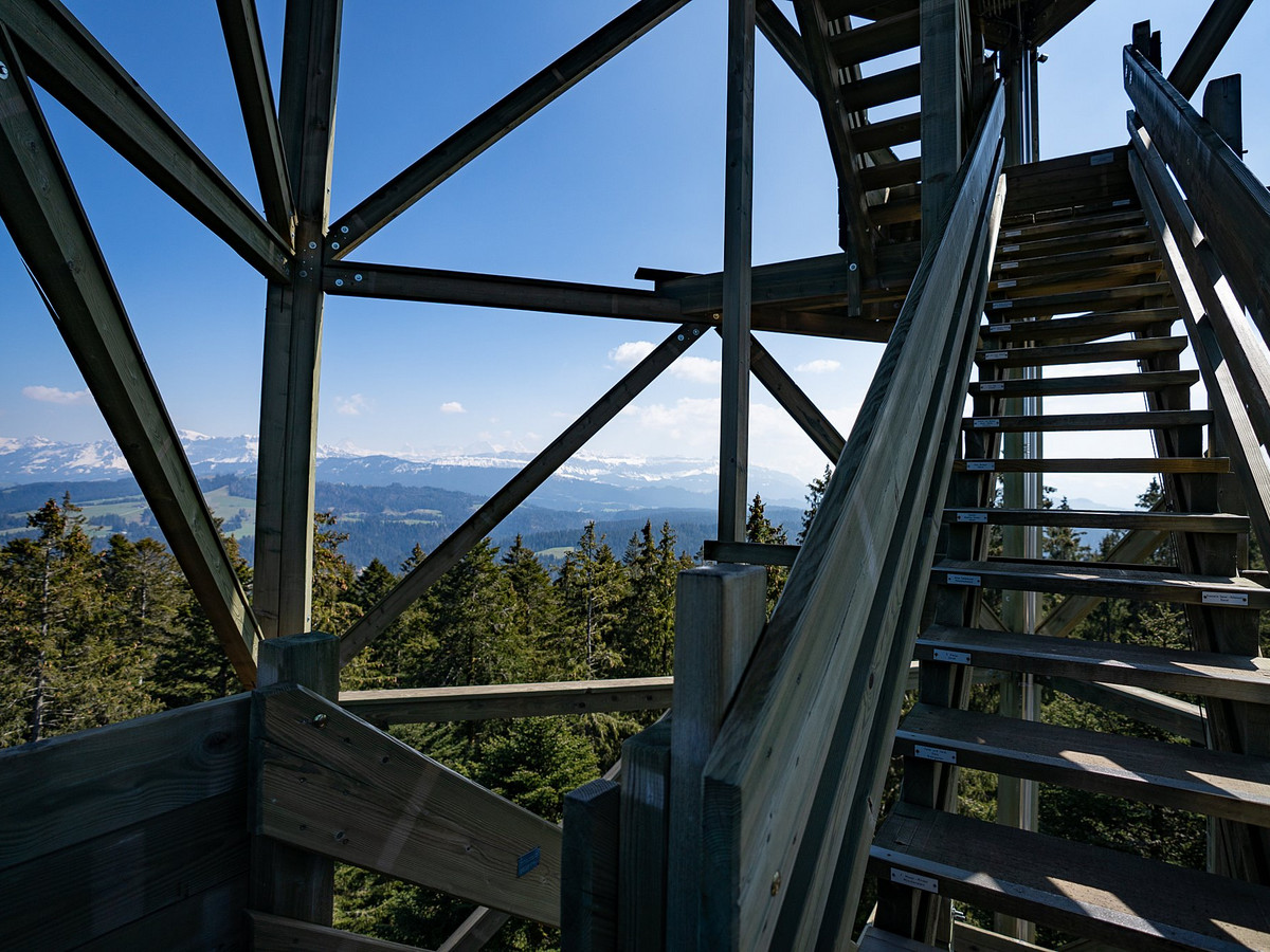 The crowning finale of our journey through the Upper Emmental is a vantage point at dizzy heights. Let the day come to a fitting end on the Chuderhüsi lookout tower. The Chüderhüsi not only attracts attention with its witty name, the tower also has a lot to offer in other respects. The 42-metre-high structure stands in the middle of an idyllic forest and is made entirely of silver fir wood. You reach the large platform via 195 steps, from where you have a breathtaking view over the Emmental. It is particularly beautiful here at sunset.