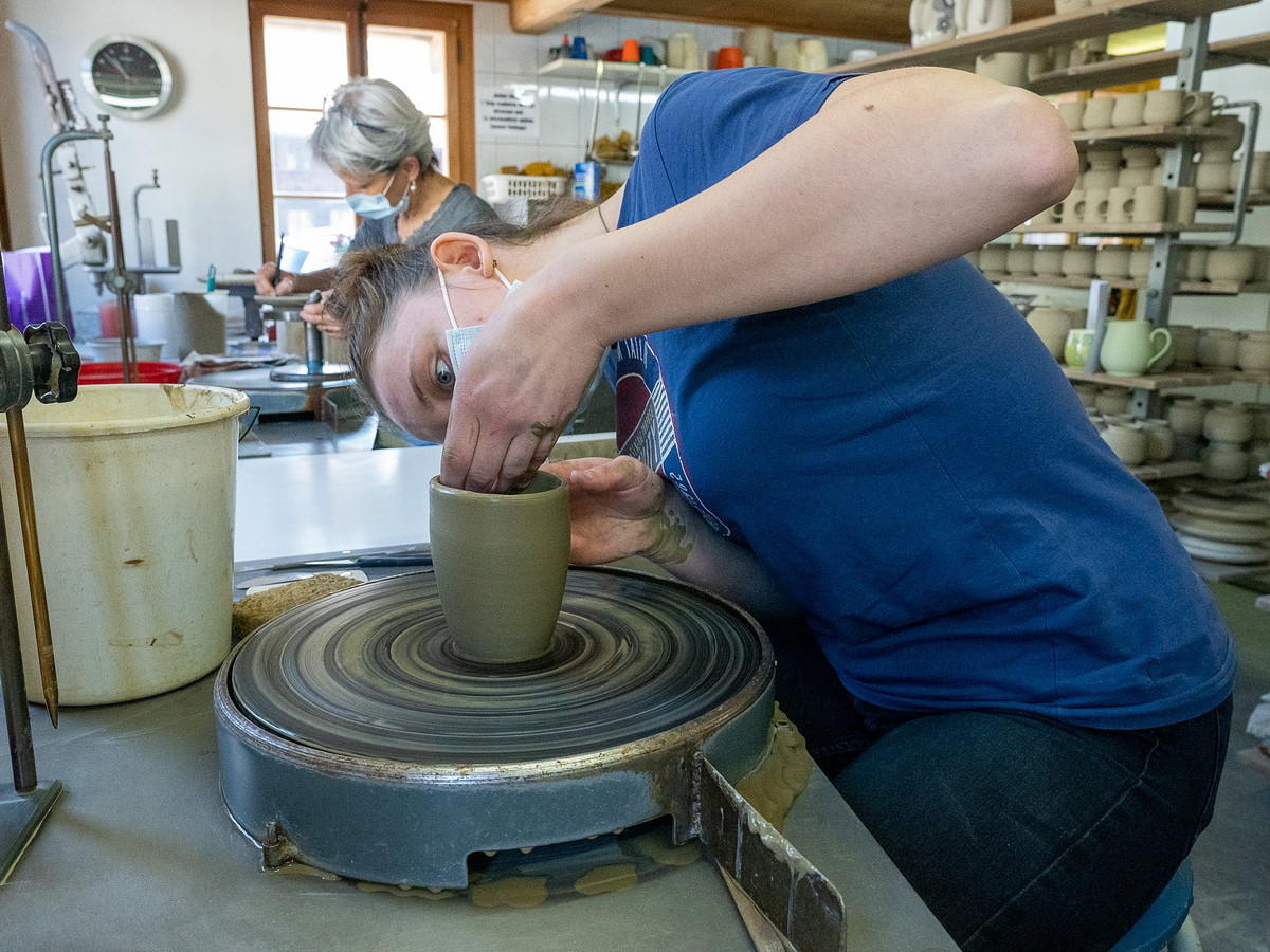 Now we follow the course of the Ilfis River to Trubschachen, where two more sights await us. In the Aebi pottery, pottery is still made as it was in the old days. Great-grandfather Aebi started producing flower pots in Hasle in 1901. At the end of 2006, Aebi closed his parent company and concentrated on the show pottery in Trubschachen, which he had run as a branch since 1982. Even today, every piece of pottery is lovingly hand-potted, painted and artistically decorated. If you would like to make a cup yourself, the pottery also offers workshops.