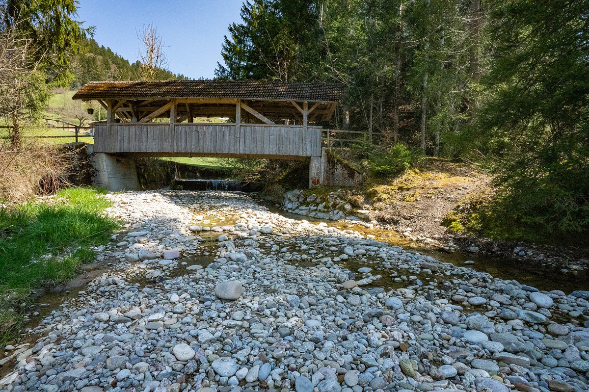 Now it's back down the hill at a rapid pace. In Eggiwil there are some particularly beautiful old Emmental farmhouses and you can also admire one of the many wooden bridges in this region. Of the 300 or so covered wooden bridges in Switzerland today, a third are in the canton of Bern and of these, a third (33) are in the Emmental. The Geissbach bridge is one of the smallest in the Emmental wooden bridge landscape. Barely ten metres long, two metres wide and around three and a half metres high, it leads over the Geissbach, which flows into the Emme a little later. Probably nowhere else can the traditional construction method of the classic simple suspension structure be studied in such detail and in such detail as on this small edition of the large Emmental wooden bridges.
