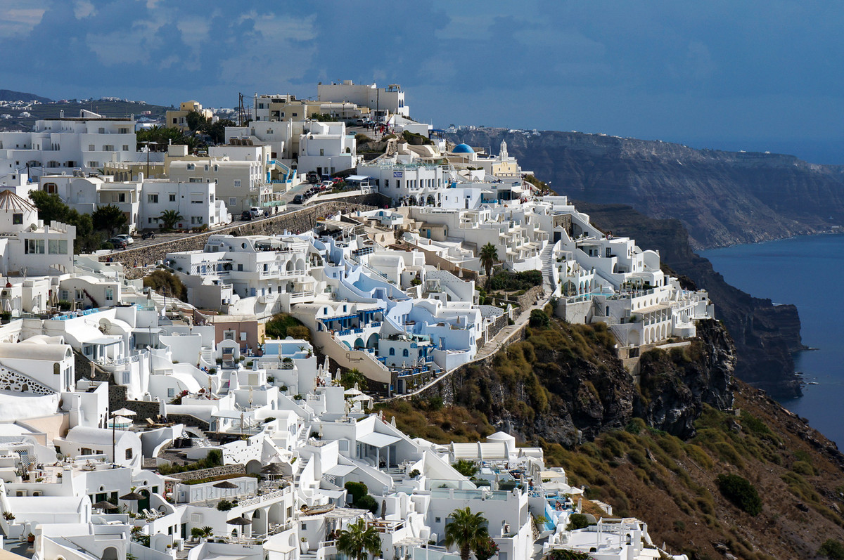 Santorini is a "postcard" island that typifies Greece: white houses with blue doors and windows, blue domes, bell towers, the steep rim of the crater with villages stuck to the cliffs, black and red beaches and world-famous sunsets.