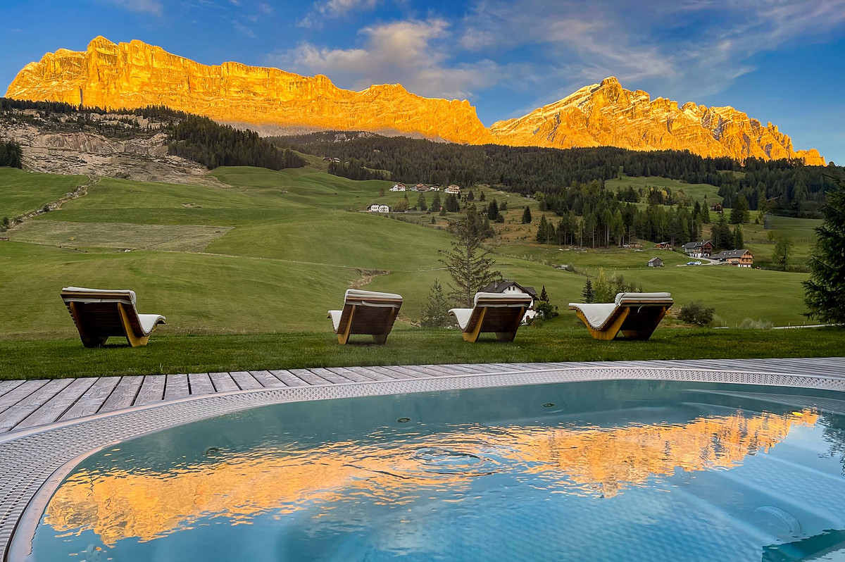 But before that, slip into your bathrobe and relax in the hotel's sauna, steam bath or whirlpool in the fresh mountain air – the Dolomite glow, or "Enrosadira" in Ladin, comes free of charge.