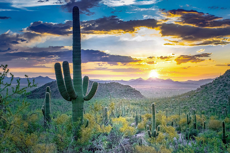 After this historical prelude, you will find tranquillity and saguaro cacti behind Tucson in the western part of the Saguaro National Park, which make for a great photo backdrop, most beautiful at sunset. The giant saguaros are considered the universal symbol of the American West. Here in the national park of the same name, some of the most impressive cactus forests of these subtropical giants are protected. Their main trunk can grow up to 15 metres high, and the first arms only form after 70 years. In May/June, the white, waxy flowers are particularly beautiful. Also, don't miss a visit to the Arizona-Sonora Desert Museum. A combination of botanical garden and small animal zoo shows the flora and fauna of the Sonora Desert. More than 300 animal species native to the desert are housed in an exemplary manner among numerous cacti and around 1200 plant species.