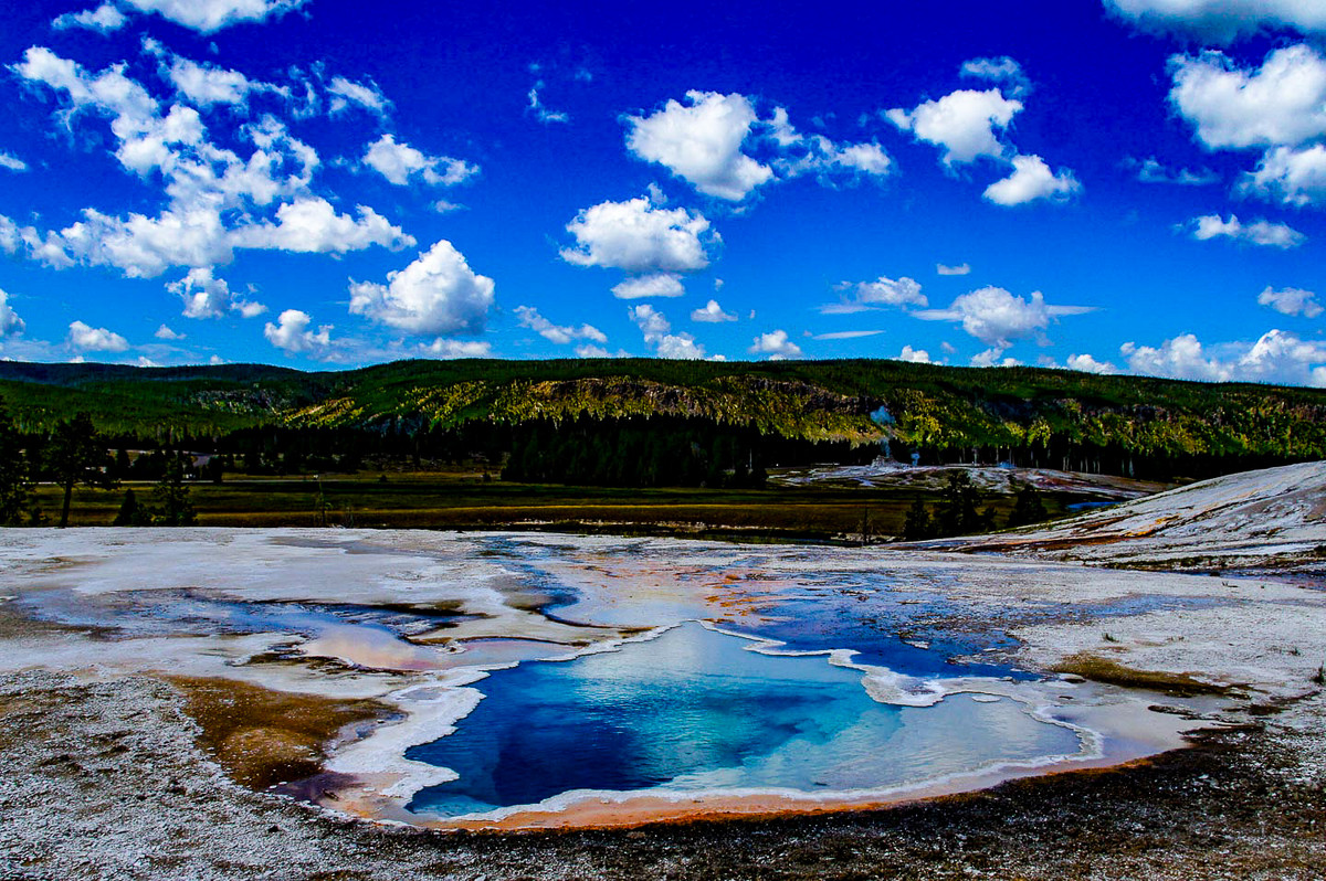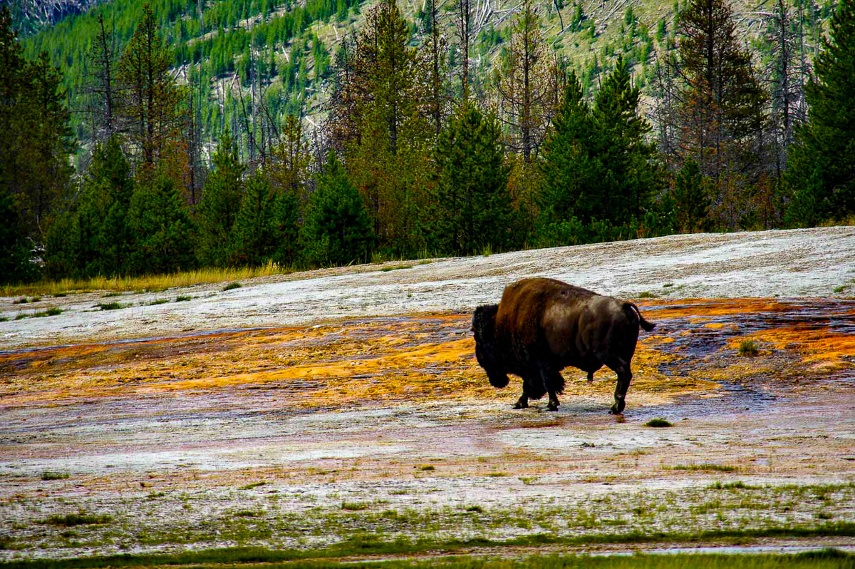 geysers, mud pots, hot springs, bears, bisons