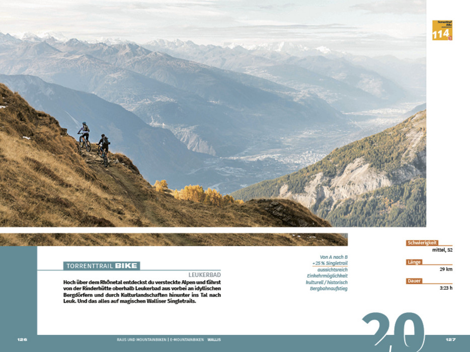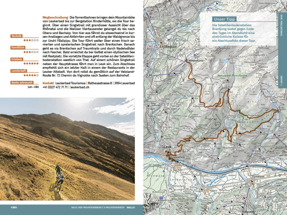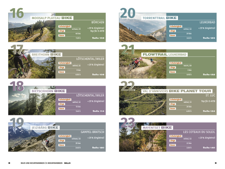 Dieser Bikeführer ist die perfekte Inspiration für die Planung der nächsten Touren. Er beschreibt offiziell homologierte Biketouren und Flowtrails. Inspirierende Bilder, kombiniert mit übersichtlichen Informationen der Touren bezüglich Schwierigkeitsgrade in Technik und Kondition. Ausprägungen in den Faktoren Erlebnis und Landschaft werden abgerundet mit einem Höhenprofil. Der Verlauf der Tour wird in einer Detailkarte dargestellt. Zusatzinformationen über besonders für E-MTB geeignete Touren, sowie Singeltrails und die Erreichbarkeit der Touren machen grosse Vorfreude auf ein unvergessliches Raus-Erlebnis.
