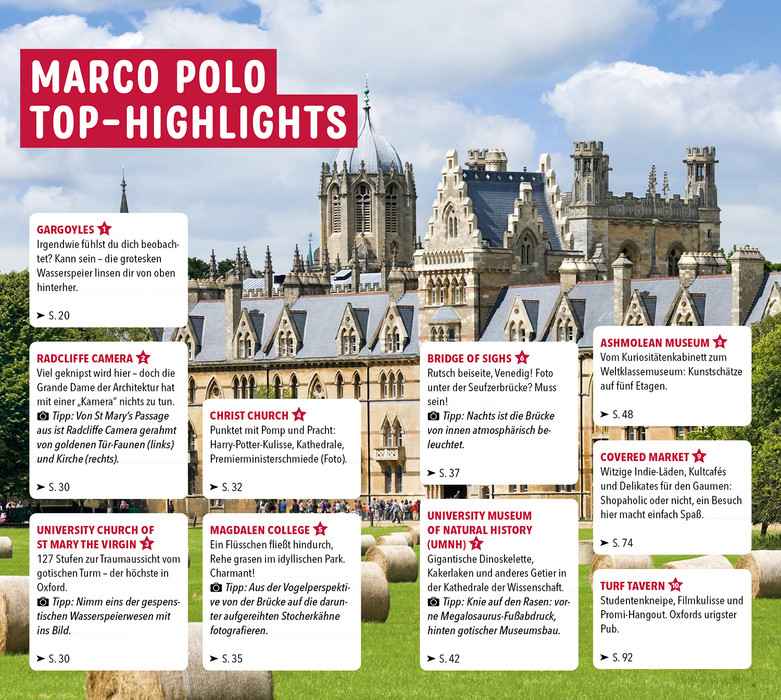 Verstaubte Unistadt? Von wegen! Oxford mag mit seinen mittelalterlichen Fassaden voller Türmchen und Wasserspeier altertümlich wirken, doch dahinter ist die Stadt jung, facettenreich und ultramodern. Ob du im Hipster-Stadtteil Jericho vom Street-Food naschst, in den trendigen Bars der Cowley Road die Nacht zum Tag machst oder dir in den romantischen Parks eine Auszeit gönnst: Mit deinem MARCO POLO Reiseführer findest du alle Must-sees der englischen Studentenstadt!