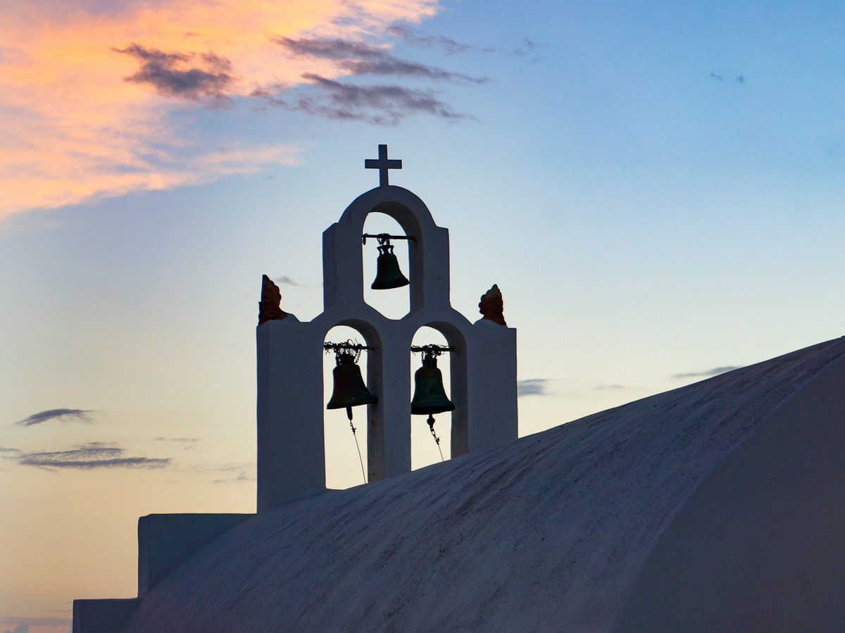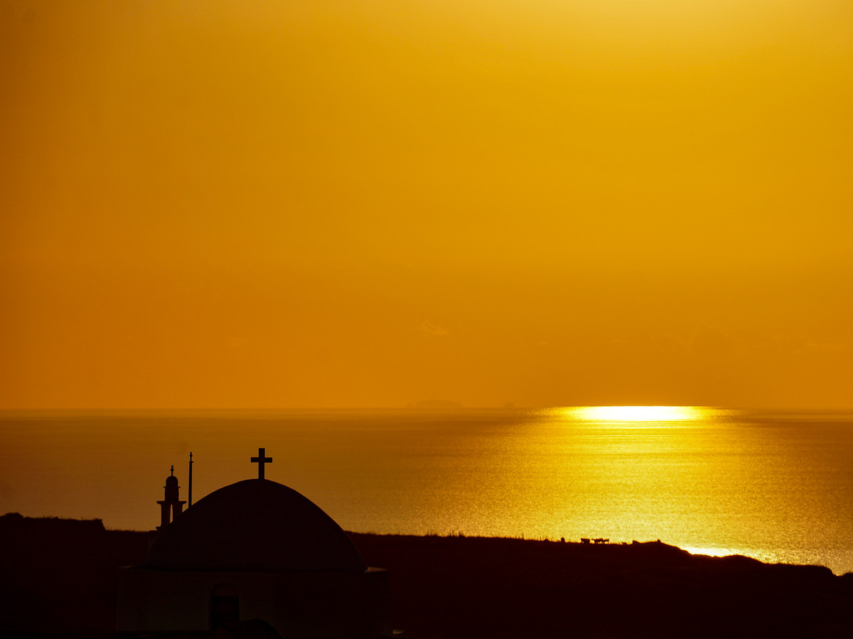 Weisse Häuser mit blauen Türen und Fensterrahmen, blaue Kuppeln, Glockentürme, schwarze und rote Strände sowie die weltberühmten Sonnenuntergänge.